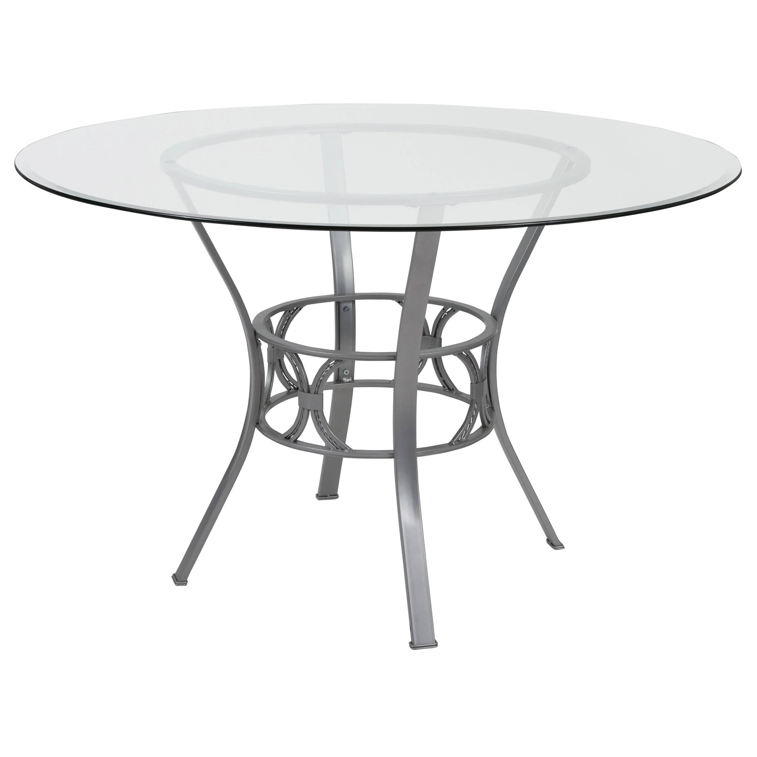 Building the perfect dining room is easier when you have a great foundation. Starting with an exquisite ornamental pedestal base this Round 48-inch Glass Top Dining Table with Silver Metal Frame is off to a phenomenal start. Crowned by a round, thick glass top with beveled edges that shimmer in the light, this striking table will add an elegant aspect to your dining room or kitchen. On the practical side, floors are protected with floor glides in case of accidental movement or rearrangement. Gather family and friends to enjoy great meals around this dazzling table.