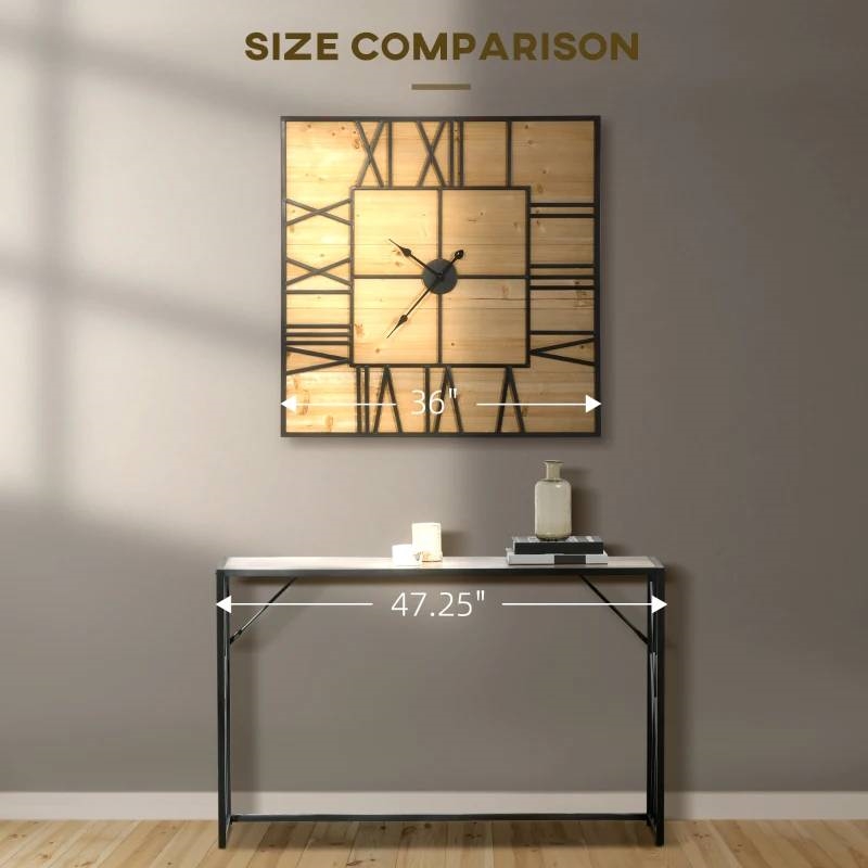 It is functional and adds elegance and style to your home; this Large 36-inch Square Roman Numerals Wall Clock Wood Farmhouse Silent Non-Ticking is a good choice. No more worry about annoying ticking. We use high-end quiet movement to ensure your thoughts or sweet dream won't bother. This wall clock decor has an attractive look that will make your home unique. Upgrade your home décor. Square shape, combining metal and wood, open face, large hands, Roman numbers, create a classic farmhouse style for your home. This farmhouse wall clock features a 36-inch diameter that grabs guests' attention. An excellent gift idea is a clock for the living room, bedroom, entryway, dining room, and home office. A big wall clock with no-second-hand, it uses high-quality quartz movement producing no ticking noises, so you can hear yourself think and get some sleep. And if you ever do have problems, we provide an extra replacement hand. With the built-in hook, this large clock is convenient for you to hang and causes less damage to the wall. Required an AA battery (not included). Made of selected metal, fir wood, high-end quartz movement and pointers, so you don't worry about rust or cracking.