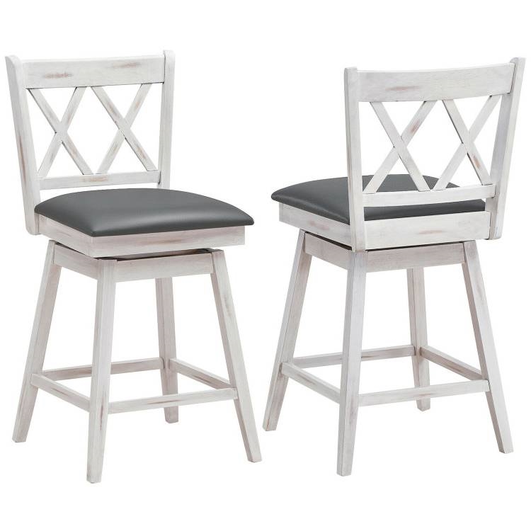 Equipped with a swivel seat, this Set of 2 White Wood 24-in Counter Height Farmhouse Swivel Cushion Seat Barstools allows you and your guests to switch directions freely, which make conversation easier. The premium footrest are able to help you rest your legs and find the most comfortable sitting position. The high density sponge padded with breathable leather covers will not only keep you away from the stuffiness, but also provide you with maximum comfort . Additionally, the ergonomic backrest gives your back additional support. The bar stool is made of high quality rubber wood with a X-back frame, making it superior to stability and durability. And it can hold up to 264 lbs. Also, the solid leg keep it stable without shaking. With simple lines and rustic chic appearance, this 2pcs bars stools adds a stylish and sophisticated look to any room. It can be perfectly matched with various decorative styles, and you can put it in your kitchen, living room, bar, cafe or restaurant. There are required parts and detailed instructions in the package. You only need to spend a little time to put it together. Besides, the upholstered seats are covered in easy-care PVC surfaces. So you can clean it effortlessly by a damp cloth.