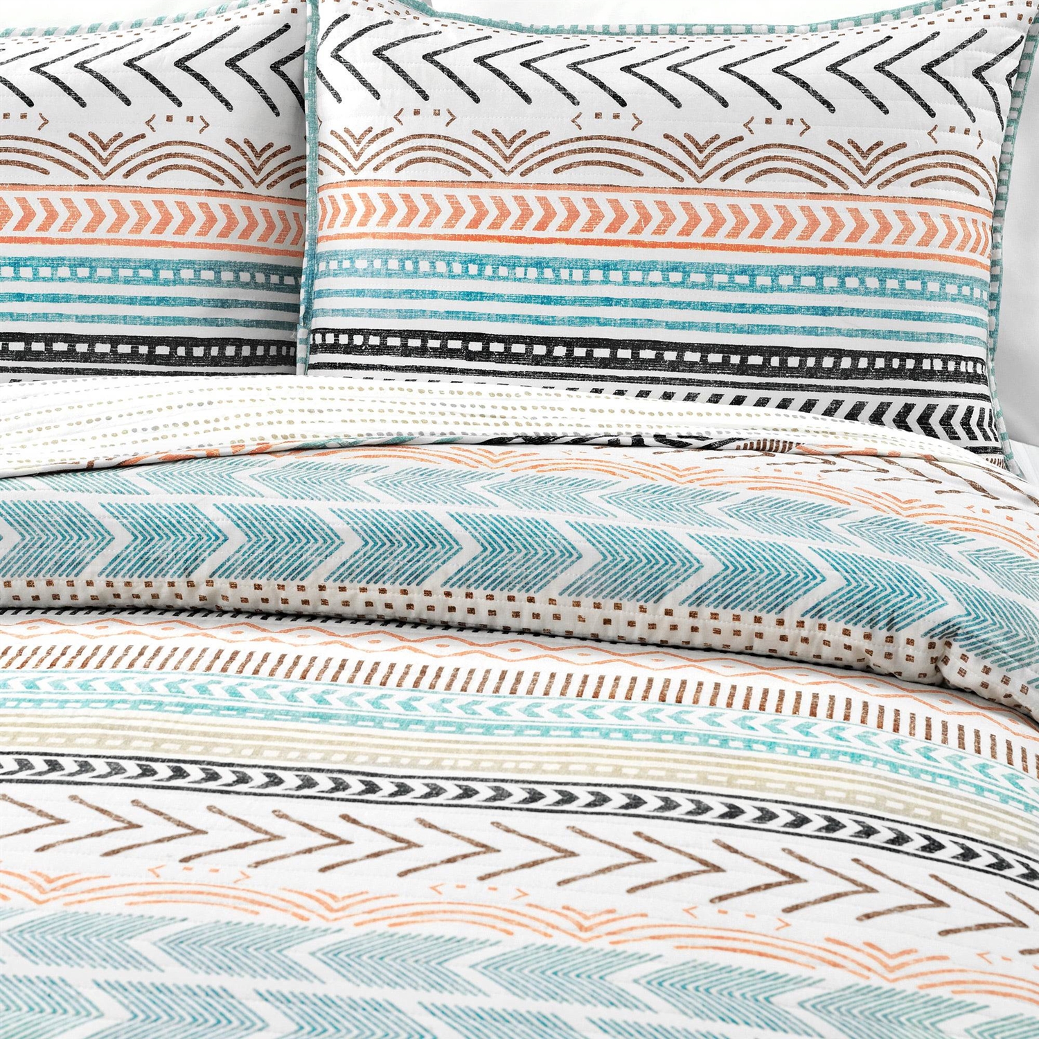 King Scandinavian Chevron Teal White Orange Brown Reversible Cotton Quilt Set