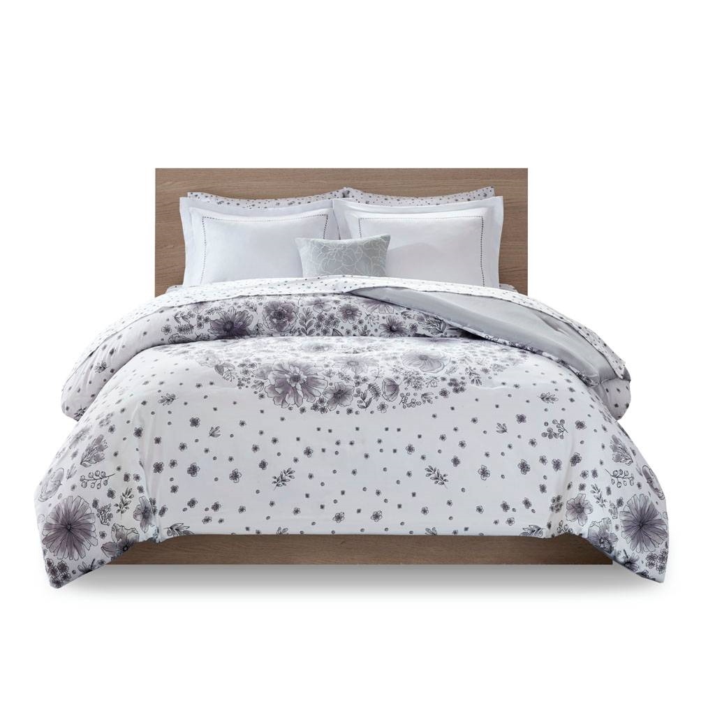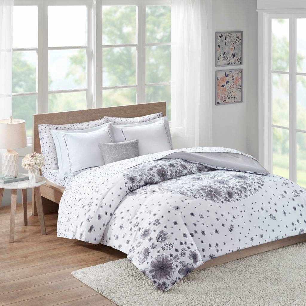 • Twin XL 6-piece White Grey Floral Pattern Microfiber Comforter Set