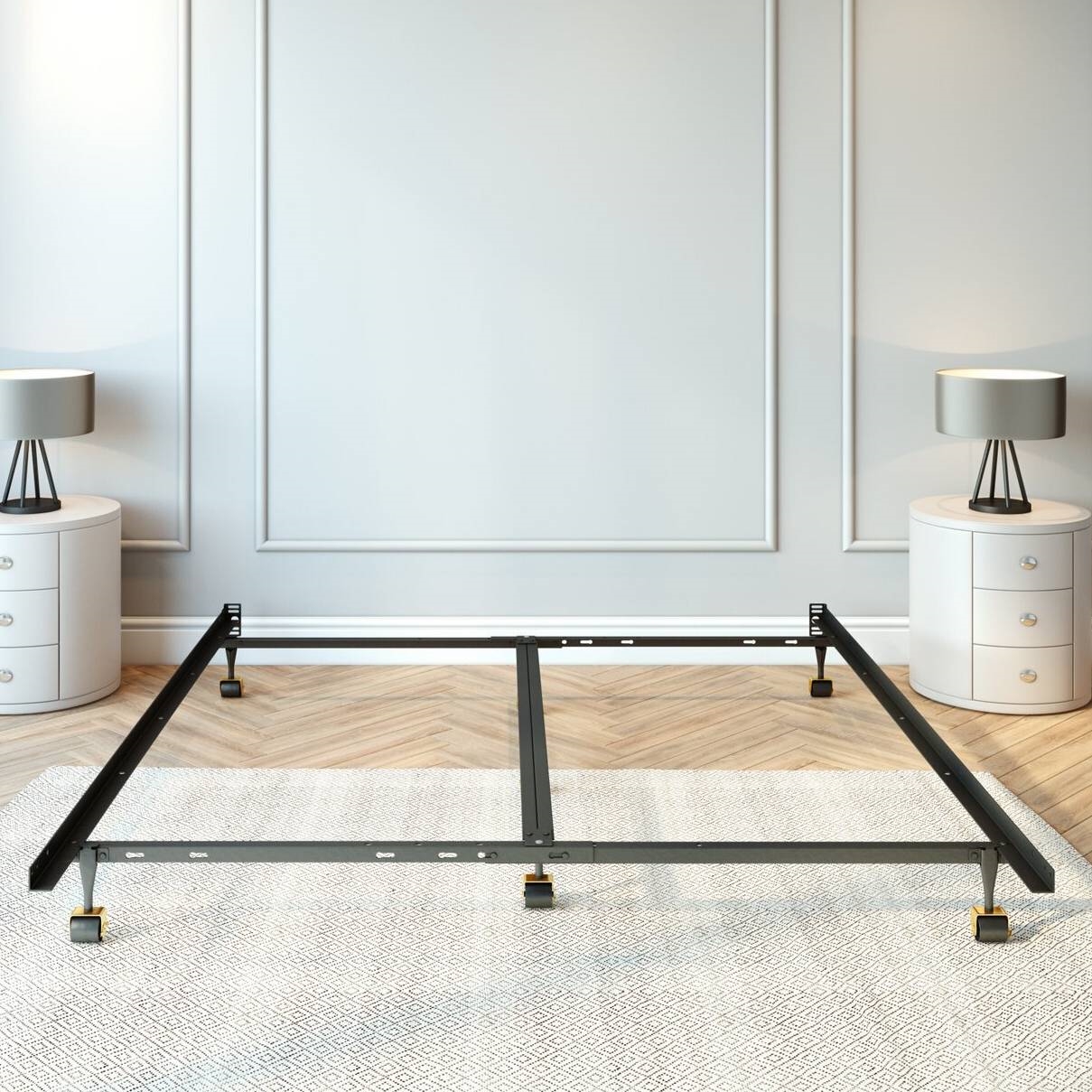 This Universal size Heavy Duty 7-Leg Metal Bed Frame with Locking Rug Roller Casters Wheels has Double Center Support Bar and 7 Rug Rollers with Locking Wheels fits size Twin, Twin XL, Full, Full XL, Queen, King and Cal King Size mattress sets. This solid black matte powder coated steel bed frame is engineered to support heavier mattress sets and feature adjustable sliding end rails. The extra-strength double rail center support bar adds extra support to your mattress and box spring in the middle to prevent sagging. Many manufacturers warranties require a center support frame. The center bar is extra wide at 2 ¼ Inch-for extra stability. 7 rug rollers make moving the mattress easy and all of the wheels lock into place to prevent further movement. The sturdy side rails keep your box spring in place so it cannot shift during use. Headboard Brackets attach to any headboard and screws that attach the bed frame to headboard are not included. Interlocking frame is easy to assemble in minutes and no additional tools are required. An additional extender bar is included for the King and California King sizes.