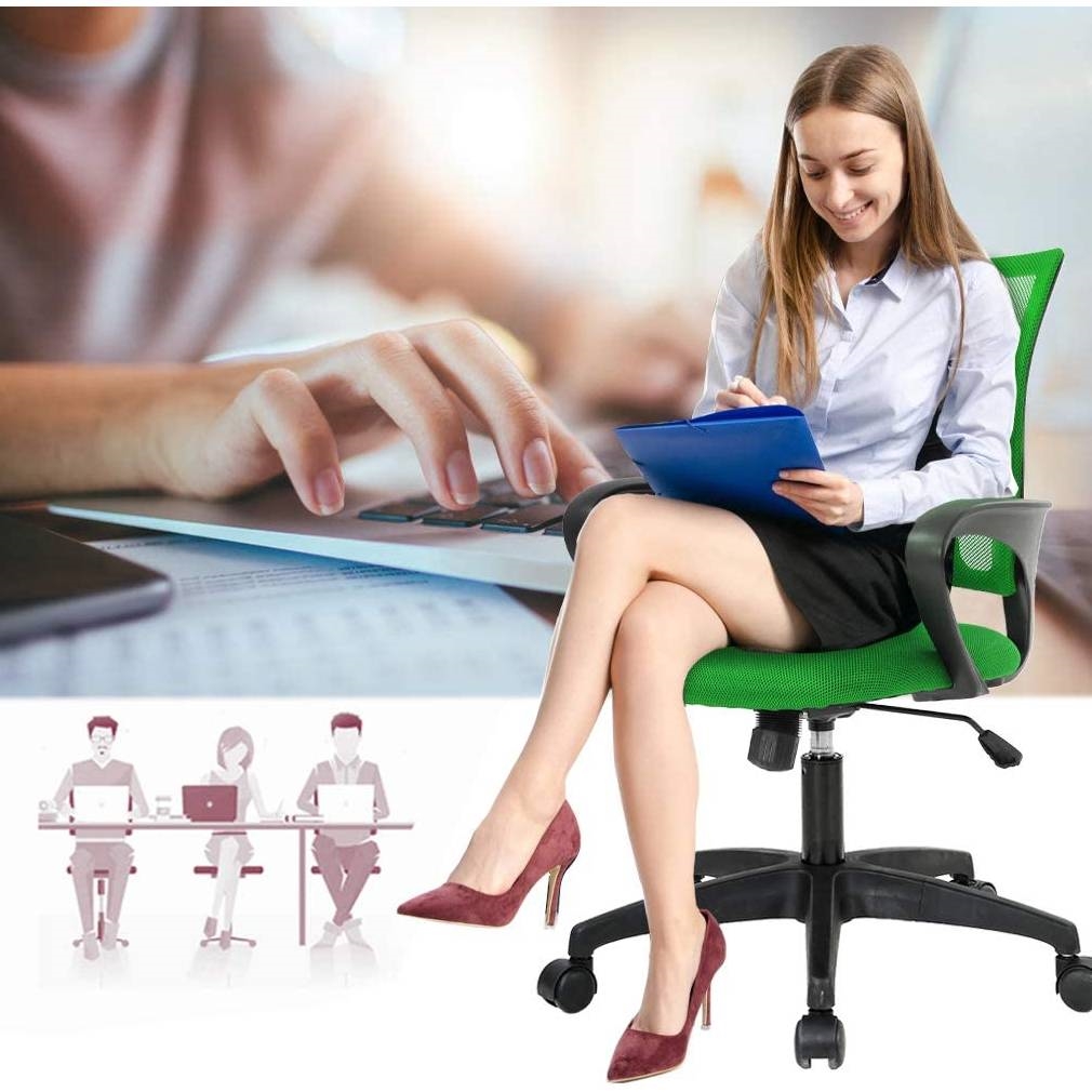 Our office chair can satisfy all your daily needs. The Green Modern Mid-Back Ergonomic Mesh Office Desk Chair with Armrest on Wheels will keep you from getting stuffy when you are using it for a long time. The soft and moderate sponge cushion will fit into your sitting position for a long time. The back and armrest of the office chair are ergonomically designed so that you won't feel tired even after a long period of work. The bottom of the desk chair is equipped with a tension adjusting knob to provide a certain degree of tilt so that you can relax after work. The adjusting lever can help you adjust the height of the seat so that the chair can reach your ideal height. Our computer chairs are suitable for all kinds of occasions, besides office, sitting in our chairs for video games is also a very good choice. The office chair comes with all hardware & necessary tools. Follow the desk chair instruction, you'll find it easy to set up, and the computer chair estimated assembly time in about 15 mins. Desk chair using high-density sponge cushion, more flexible, office chair with a middle back design, can provide good Lumbar Support. The mesh chair uses a high breathable mesh back to make your back feel comfortable. It is a good choice to add one of our office chairs in your office, put a desk chair in front of your home, and put a set of our computer chairs in your activity room. The cushion of the office chair, armrest accord with human body engineering design, let your body and mesh chair perfect fit, suit long time use. All the accessories of our office chair have passed the commercial test, which is a guarantee for your personal safety. The mesh chair can bear the weight of 250 lbs.