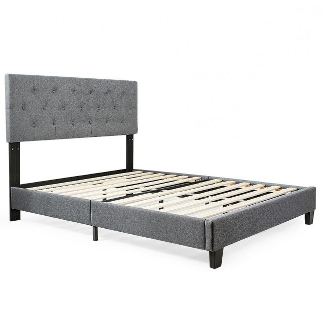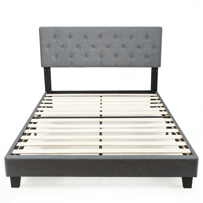 Give your bedroom a soft modern flair with the Queen Size Grey Linen Upholstered Platform Bed. A rectangle tufted grey headboard with soft coves, this bed provides eye catching beauty along with a comfortable nights sleep. Unique low profile footboard makes it the perfect centerpiece for any bedroom. No box spring needed. This queen size bed fits any standard queen size mattress. Mattress is not included. Comes with padded side rails and 12 thick wooden slats.