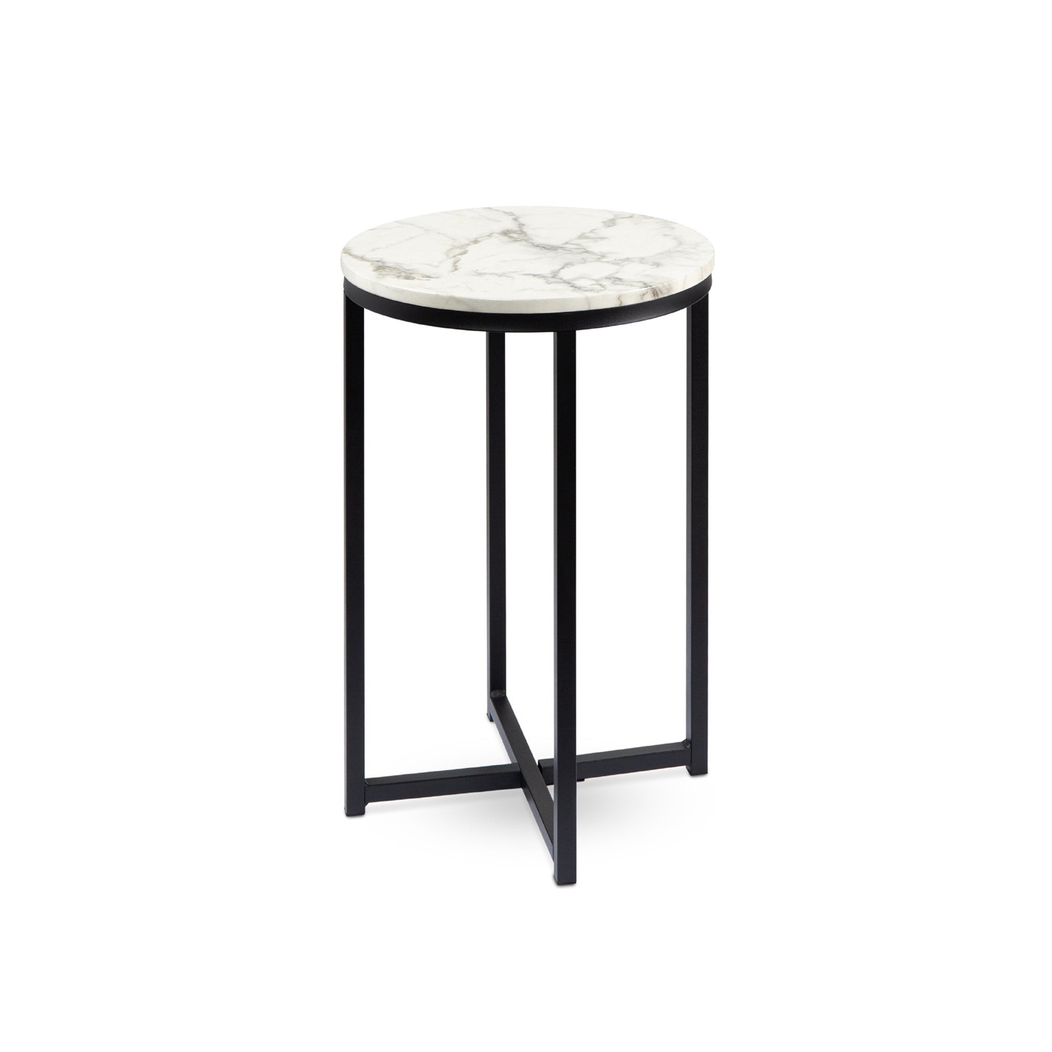 Simplify your home with the super easy to assemble Round Cross Leg Design Coffee Side Table Nightstand with Faux Marble Top White/Matte Black. Serves as a modest yet classy living room addition for placing magazines, snacks, beverages, or just a decorative centerpiece for any room. The sturdy legs are connected with a cross design for maximum stability under a durable, laminate faux marble table top that holds up to 55 lbs.