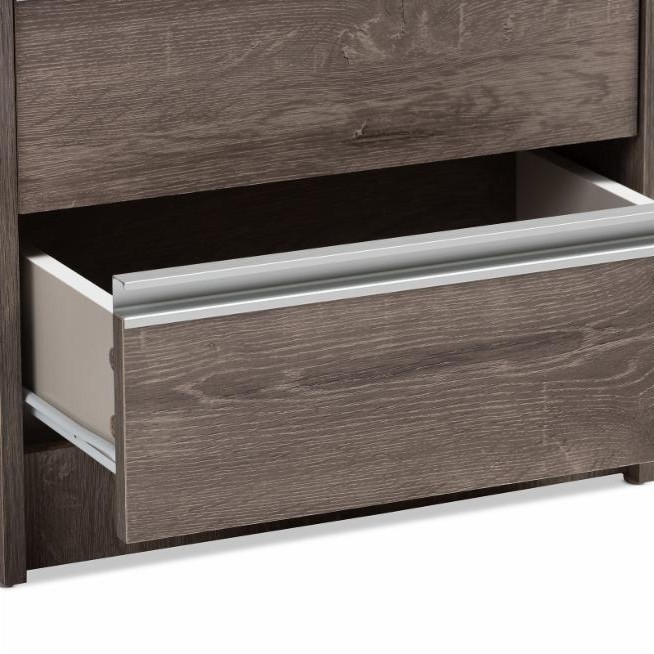 Rustic simplicity is the theme of this Rustic FarmHome 2 Drawer Nightstand Natural Oak. This nightstand boasts a sleek shape as well as a natural oak finish. Woodgrain detail ensures an authentic look that lasts. Two drawers offer ample storage space and are complete with silver metal drawer pulls for easy open/close