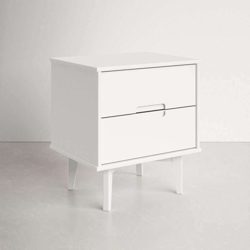 This FarmHouse 2 Drawer Solid Wood Nightstand white will add a stylish finish to your bedroom with the mid-century modern and transitional design. With a stained white finish, featuring angled legs and unique cutout handles that add to the design. Including two deep-storage drawers for putting away books, accessories, and more.