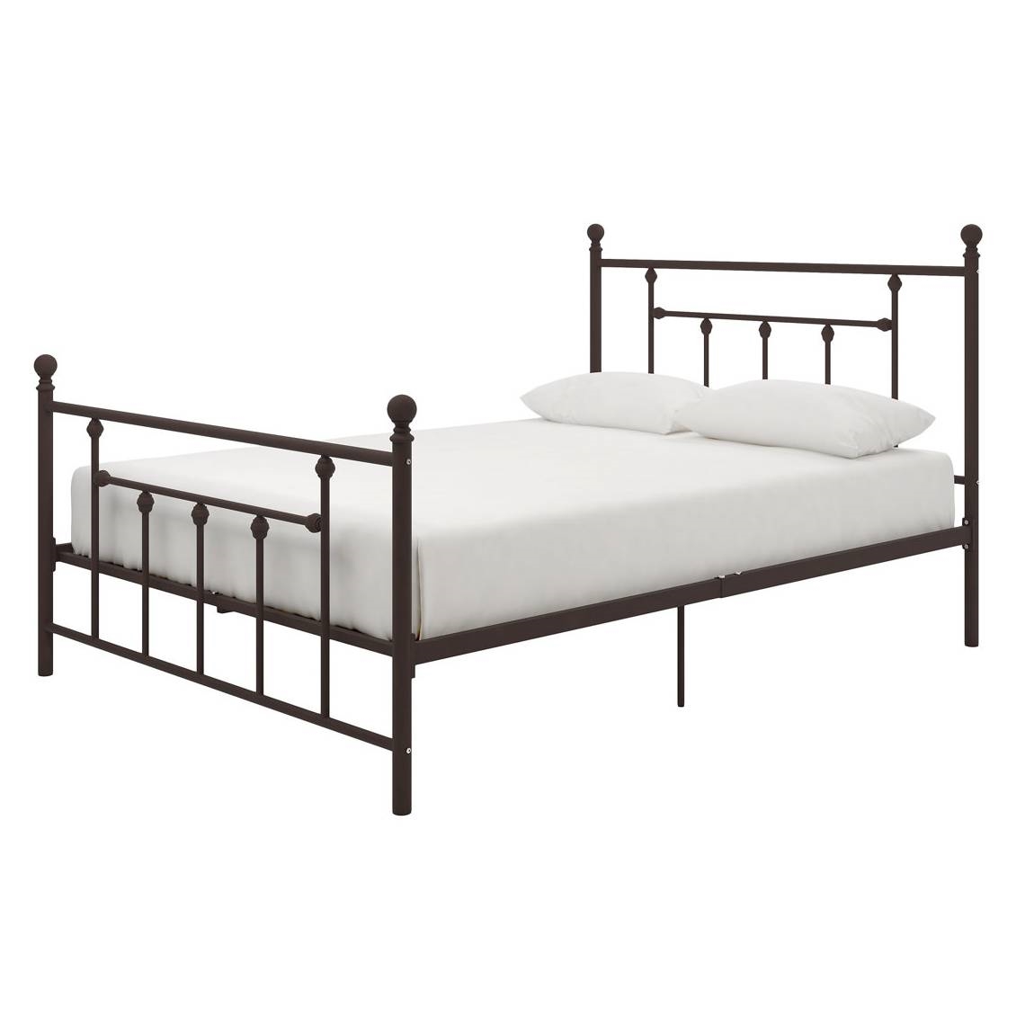 This Full size Metal Platform Bed Frame offers a breezy traditional style for eclectic bedrooms, highlighted by open head and footboards with classic finial accents. Durably crafted from steel metal, in your beautiful bronze finish, this bed features heavy duty metal slats for reliable sleeping support without a box spring.