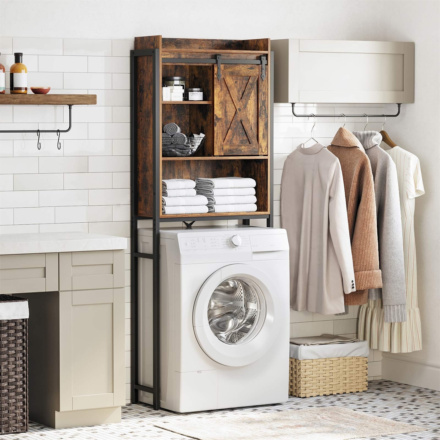Ample Storage Space makes this FarmHouse Over The Toilet Sliding Barn Door Storage Cabinet Cupboard ideal for any bathroom or laundry area. The 3 shelves and a small cupboard are sufficient to store toilet paper, towels, and gels. The mix of the rustic particleboard and the black steel frame gives your bathroom an industrial style.
