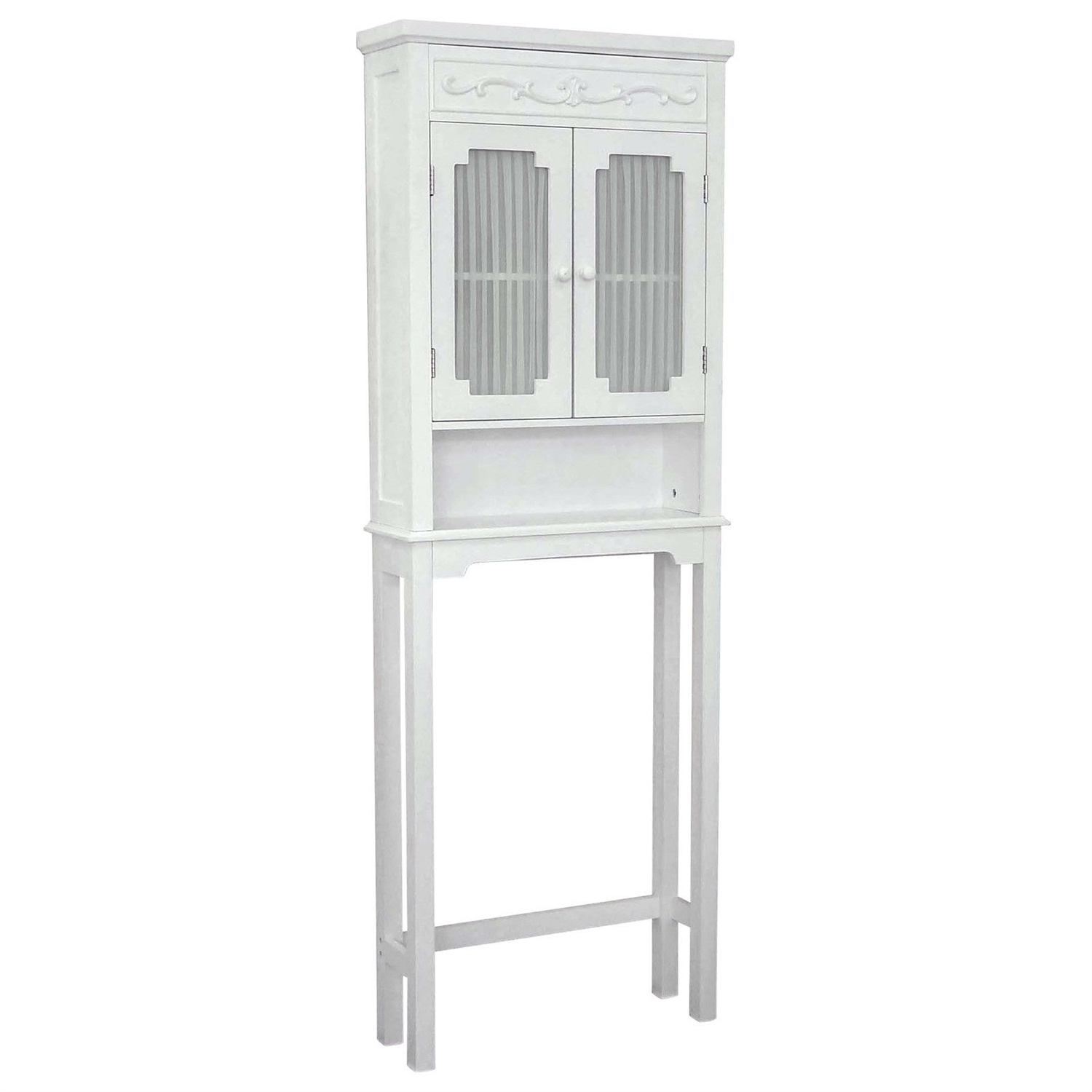 Do you have a small, cluttered bathroom? Get the clutter off your bathroom counter by putting a Frosted White Elegant Glass Doors Bathroom Space Saver behind your toilet. There's no need to install this piece on the wall - just set it up and start maximizing every inch of your small bathroom. Two glass-paned doors with frosted white curtain details conceal an adjustable shelf for organizing your assorted toiletries. Made of medium-density fiberboard laminate with a charming antique white finish, this cabinet features delicate wood carving on the top rail as the crowning touch. Some assembly required.