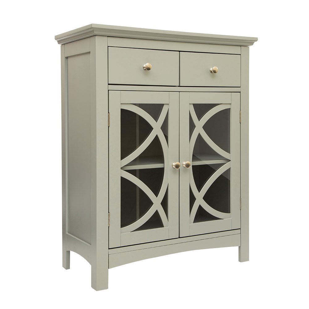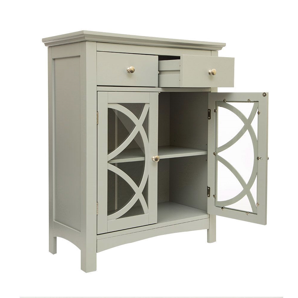 This Modern 32-inch Bathroom Floor Cabinet with Glass Doors in Gray Wood Finish makes an ideal storage or display solution for your home. This storage cabinet with double doors features several storage areas with shelves and a drawer. It offers ample space for accessories such as books, dinnerware, towels and more. The elegant finish and accompanying ergonomic handles will complement any home decor. The Storage Cabinet requires easy assembly with household tools. Product Specifications Package include: Cabinet piece pack x1pc, Hardware pack x1, Instruction x1 Color info: Gray Material: 100% MDF wood Size:26"L*12.4"W*32.1"H Product Warranty.