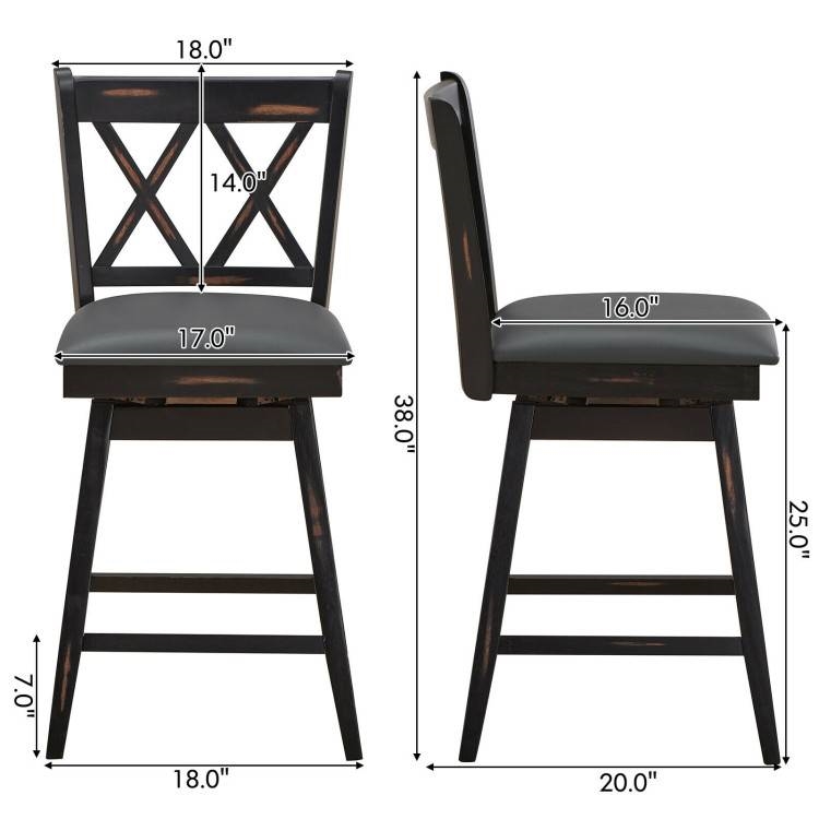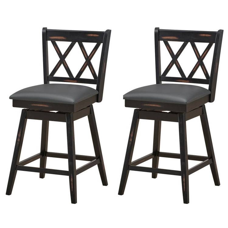 Equipped with a swivel seat, this Set of 2 Black Wood 24-in Counter Height Farmhouse Swivel Cushion Seat Barstools allows you and your guests to switch directions freely, which make conversation easier. The premium footrest are able to help you rest your legs and find the most comfortable sitting position. The high density sponge padded with breathable leather covers will not only keep you away from the stuffiness, but also provide you with maximum comfort . Additionally, the ergonomic backrest gives your back additional support. The bar stool is made of high quality rubber wood with a X-back frame, making it superior to stability and durability. And it can hold up to 264 lbs. Also, the solid leg keep it stable without shaking. With simple lines and rustic chic appearance, this 2pcs bars stools adds a stylish and sophisticated look to any room. It can be perfectly matched with various decorative styles, and you can put it in your kitchen, living room, bar, cafe or restaurant. There are required parts and detailed instructions in the package. You only need to spend a little time to put it together. Besides, the upholstered seats are covered in easy-care PVC surfaces. So you can clean it effortlessly by a damp cloth.