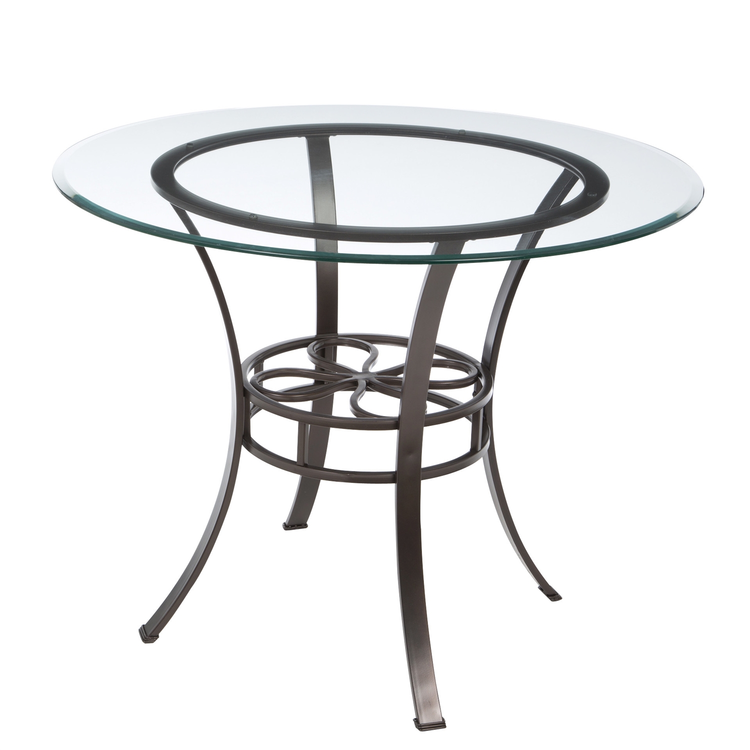 This round glass top dining table is classically styled with a modern flair. The look is representative of classic scrolled iron, but with a powder coated texture finish in a dark chocolate color to fit seamlessly into your dining room. The solid glass top adds the perfect accent to this stylish dining table. Matching set of 4 dining chairs sold separately.