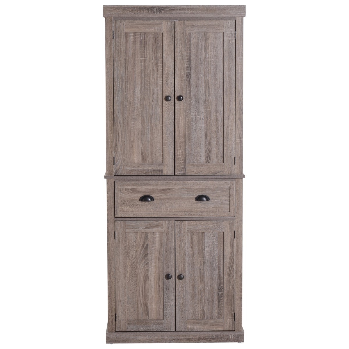 This elegant FarmHome 6ft Kitchen / Bathroom Storage Pantry Drawer Cabinet Wood Grain becomes a functional centerpiece in any room, adding charm along with ample storage and display space. The kitchen pantry features a single center drawer with both the upper and lower doors opening to 1 fixed and 2 fully adjustable shelves, which allows for flexible storage space that fits your individual needs. The kitchen pantry features a single center drawer with both the upper and lower doors opening to 1 fixed and 2 fully adjustable shelves, which allows for flexible storage space that fits your individual needs. Constructed from engineered wood with a reinforced backboard and wall attachments for added stability and safety. he vertical kitchen cabinet takes up little floor space that measures 30 inches W x 16 inches D x 72.5 inches H, with an overall 220lbs weight capacity.