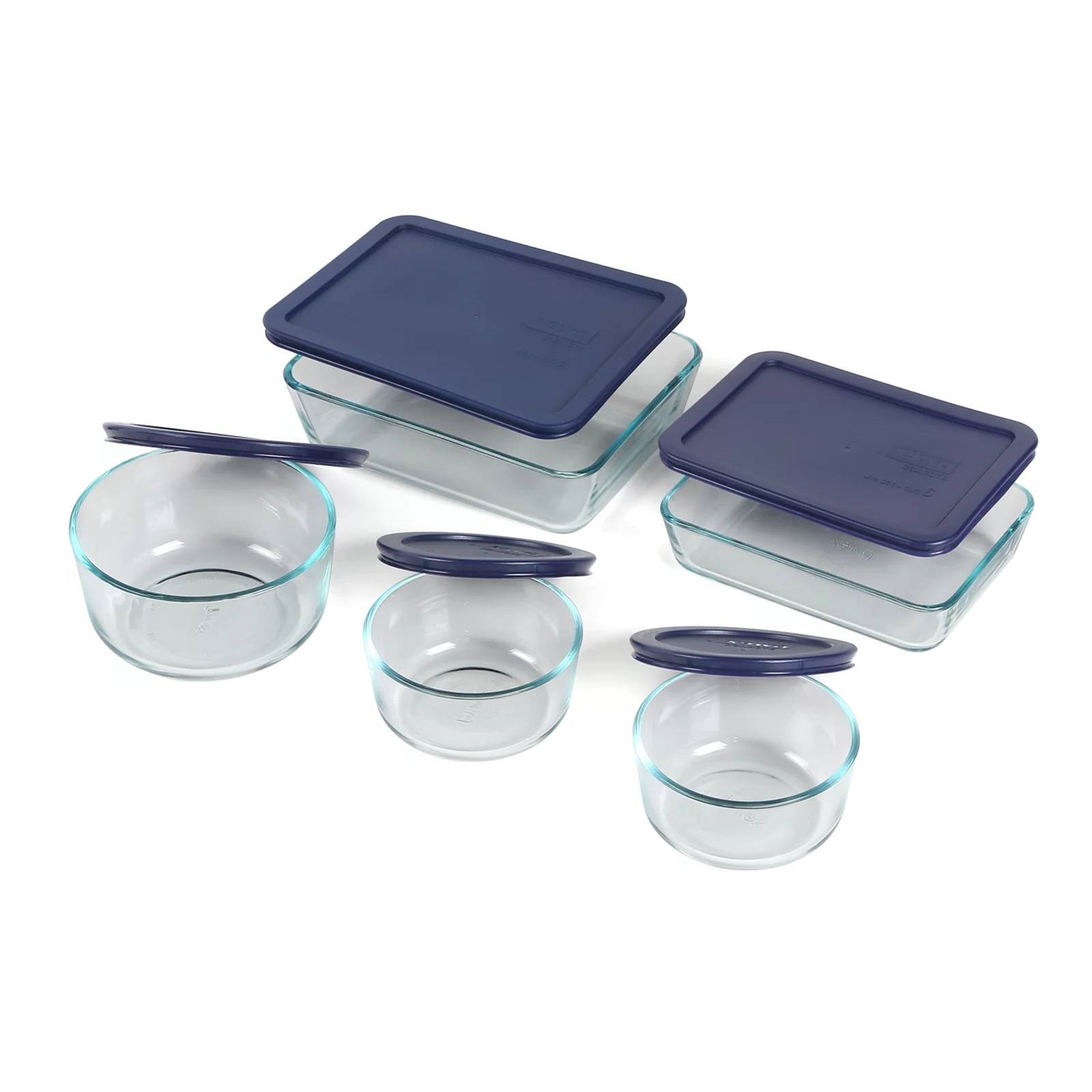 Keep your baked food and snacks well organized with the 10-Piece Glass Bakeware Food Storage Set with Blue Plastic Lids Dishwasher Safe. This 10 piece bakeware set offer sufficient space for placing all your baked cookies, cakes, and pastries. They can be safely placed in ovens, microwaves, refrigerators and freezers. Built from non-toxic borosilicate glass, the Storage Plus 10 Piece Bakeware Set from Pyrex lasts for many years. They feature a clear transparent finish with blue lids.