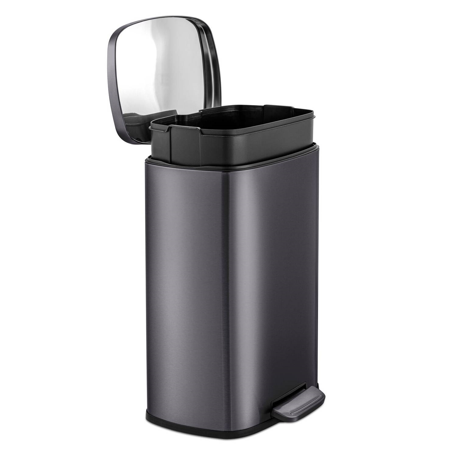 Minimal design 50 Liter / 13.2 Gallon black stainless steel kitchen trash can. Rectangular shape garbage can with step pedal open lid. Constructed from commercial-grade T430 stainless steel and built to withstand consistent use. Fingerprint-resistant body, soft-close lid, removable leak-proof inner bucket, and non-skid base – to provide you with an exceptional trash experience at your home kitchen, or office.